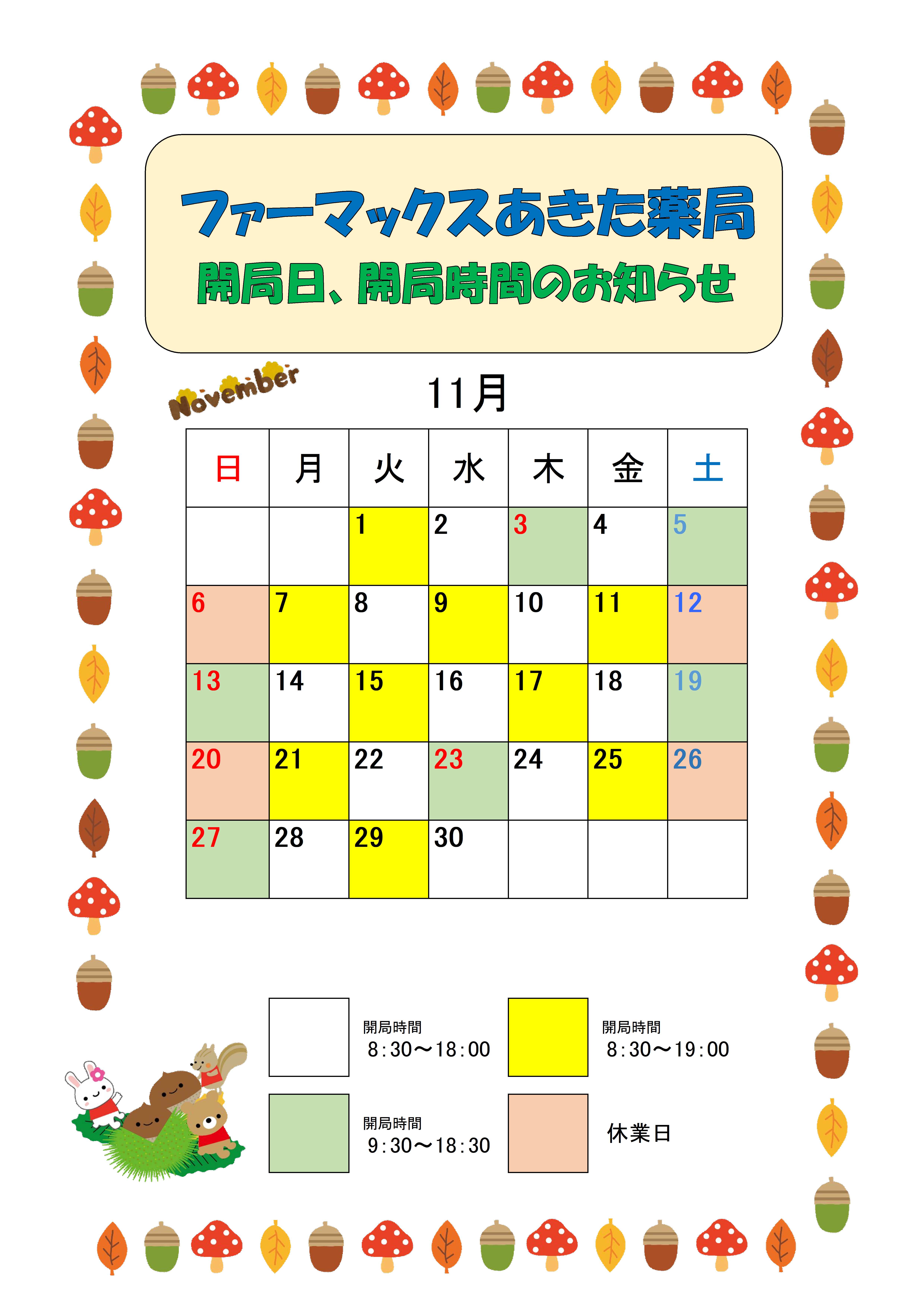 ファーマックスあきた薬局 11月・12月開局日のお知らせ