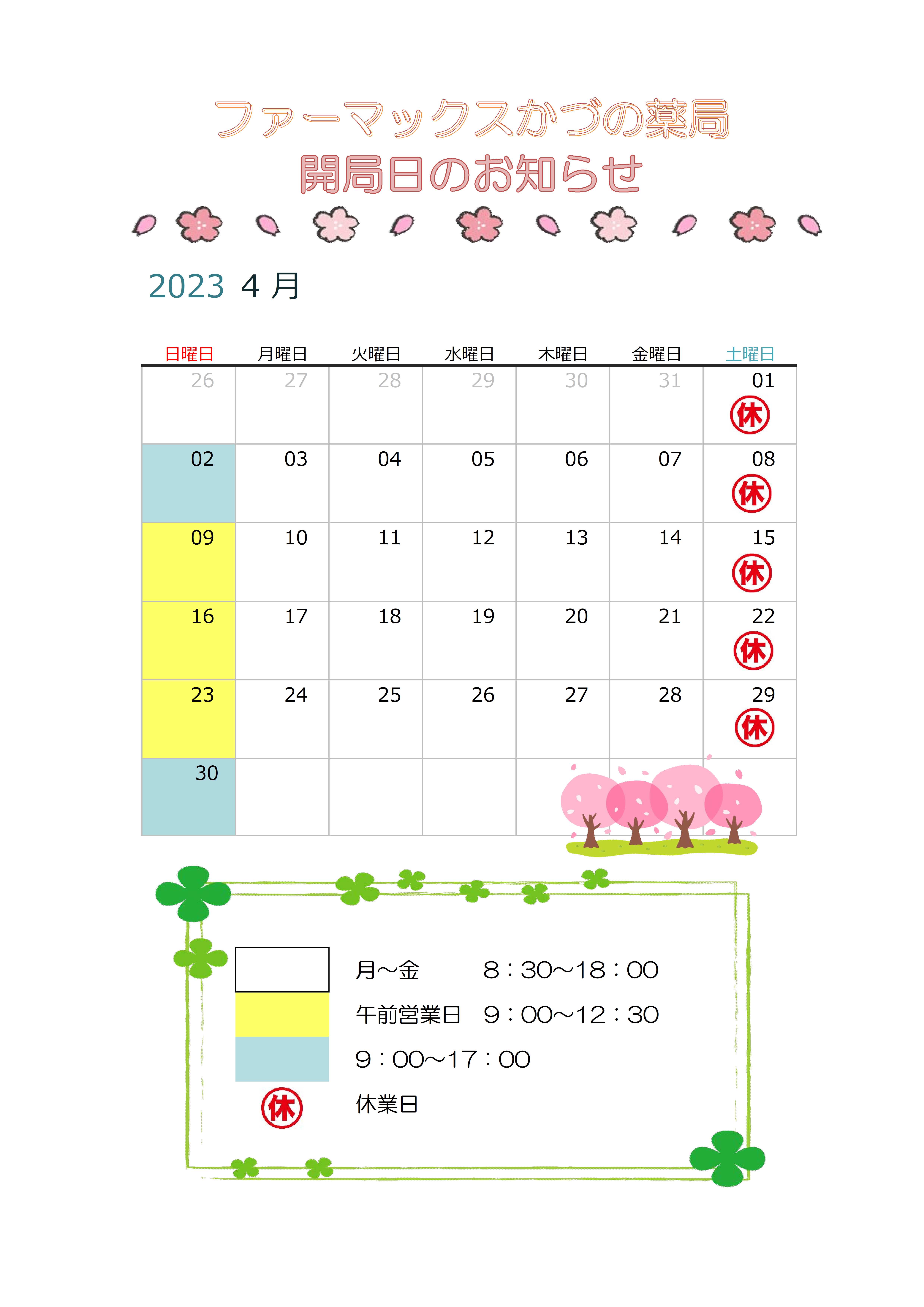 ファーマックスかづの薬局 4月開局日、開局時間のお知らせです。